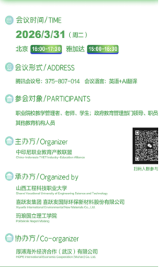 为推进学院国际交流工作有序开展,2026年3月31日下午,“中印尼职业教育大讲堂——绿色建造与循环材料创新”专题讲座在线上举行。本次讲座由中印尼职业教育产教联盟主办,山西工程科技职业大学、山西喜跃发国际环保新材料股份有限公司和印尼玛琅国立理工学院联合承办,利用腾讯会议平台,通过英语+AI中文实时翻译模式,共有中印尼两国100余名职业院校教学管理人员及师生参与。